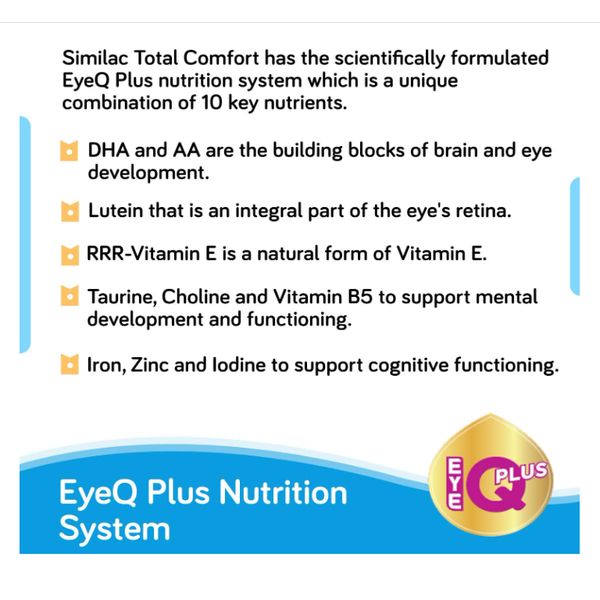 • EyeQ Plus System contains Natural Vitamin E, Lutein; and DHA that supports brain and eye development.