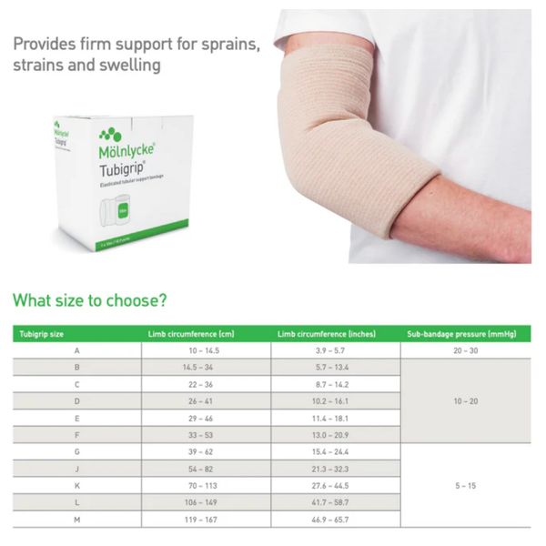 Tubigrip® provides lasting, effective support for the treatment of strains and sprains, soft tissue injuries, general oedema, post-burn scarring and ribcage injuries. It can also be used for pressure dressings, and provides complete freedom of movement for the patient.